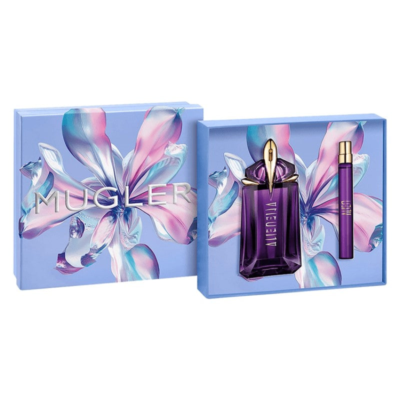 Mugler Alien Eau De Parfum Gift Set is a perfume set that includes a 60 ml bottle and a 10 ml travel size, so you can enjoy the scent both at home and on the go. Alien Eau de Parfum is a floral amber and woody fragrance that highlights feminine strength through a brilliant combination of jasmine sambac, cashmere wood and white amber. The fragrance opens brightly, develops a sensual heart and is rounded off with a soothing base that leaves a warm and memorable scent trail. The iconic bottle, shaped like an amethyst talisman, reflects the mysterious and bold character of the fragrance. The set provides an elegant fragrance experience that is suitable for both everyday use and special occasions.
